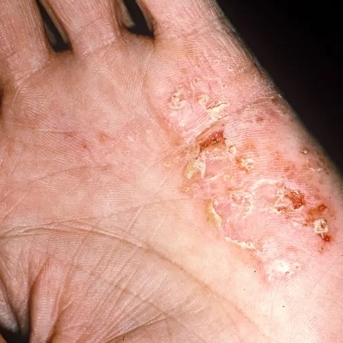 Athlete’s foot is a common fungal infection affecting the skin between the toes and sometimes the soles of the feet. It often causes itching, redness, burning sensation, and cracked skin. The infection thrives in warm, moist environments such as sweaty shoes or public locker rooms. Maintaining proper foot hygiene is essential to prevent recurrence. Ayurvedic treatment focuses on controlling fungal growth, reducing inflammation, and improving skin health. Herbal preparations, cleansing remedies, and lifestyle measures help relieve symptoms and support faster healing while promoting healthier skin and preventing the spread of infection.